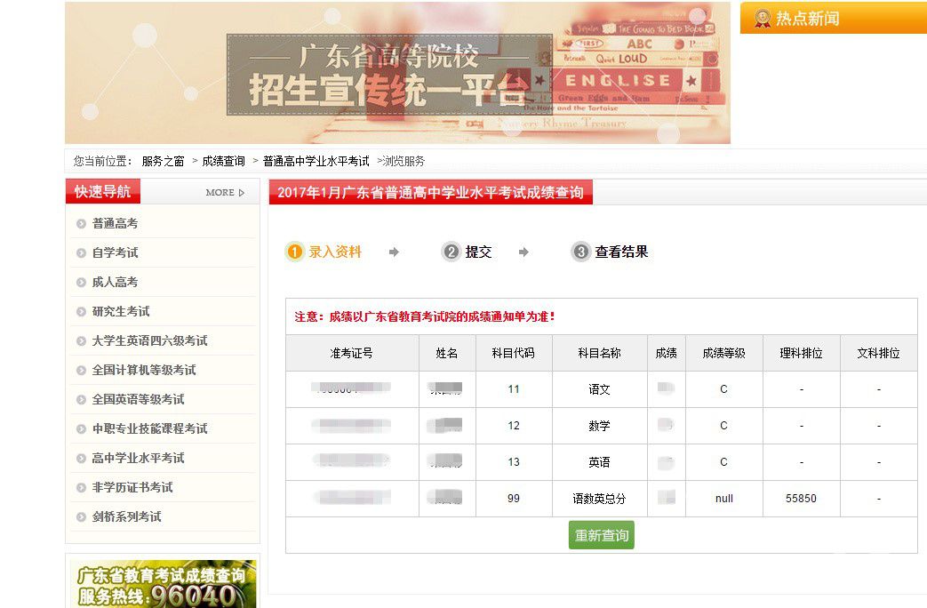 由于《2017年1月广东省普通高中学业水平考试成绩通知单》广东省相关部门尚未发放,请考生自行登录广东省教育考试服务网成绩查询系统,将本人成绩查询页面截图(如下图),打印并加盖所在中学学校公章确认。2016年6月及之前的学业水平考试必须提交成绩通知单复印件,不能以成绩查询页面截图代替。